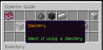 Po registraci a přihlášením na server dostanete automaticky Slimefun Guide, kterou potřebujete při práci se Slimefunem. Pokud jste tuto knihu ztratili tak stačí otevřít chat a napsat /sf guide. Kliknutím pravým tlačítkem na myši s knihou v ruce sa vám otevře Slimefun Menu, kde sa vám zobrazují různe kategorie od zbraní až po složitější přístroje. Levým kliknutím v menu vyberete kategorii / předmět, který chcete zobrazit. Nahoře sa vám objeví kniha, kterou se vrátíte zpět.